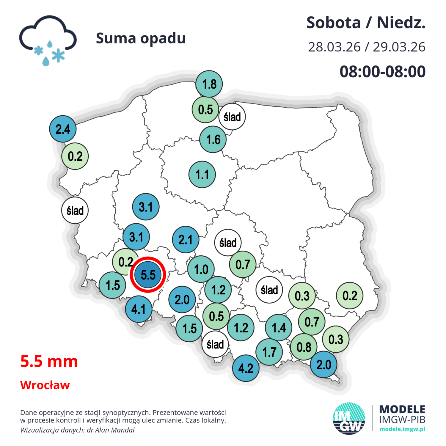 Za ostania dobę opadową najwyższa suma opadów na stacjach synoptycznych pojawiła się we Wrocławiu (5,5 mm). W wielu nie padało.