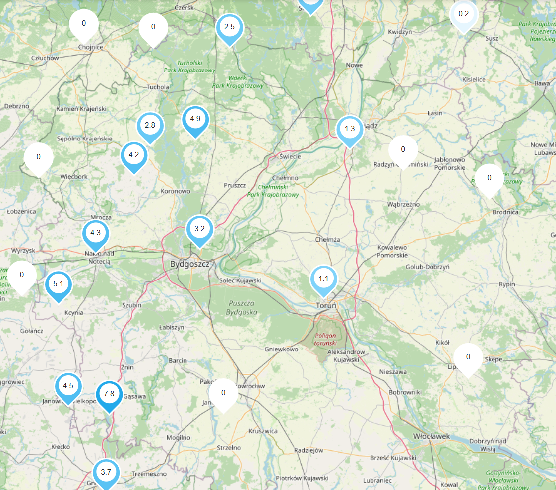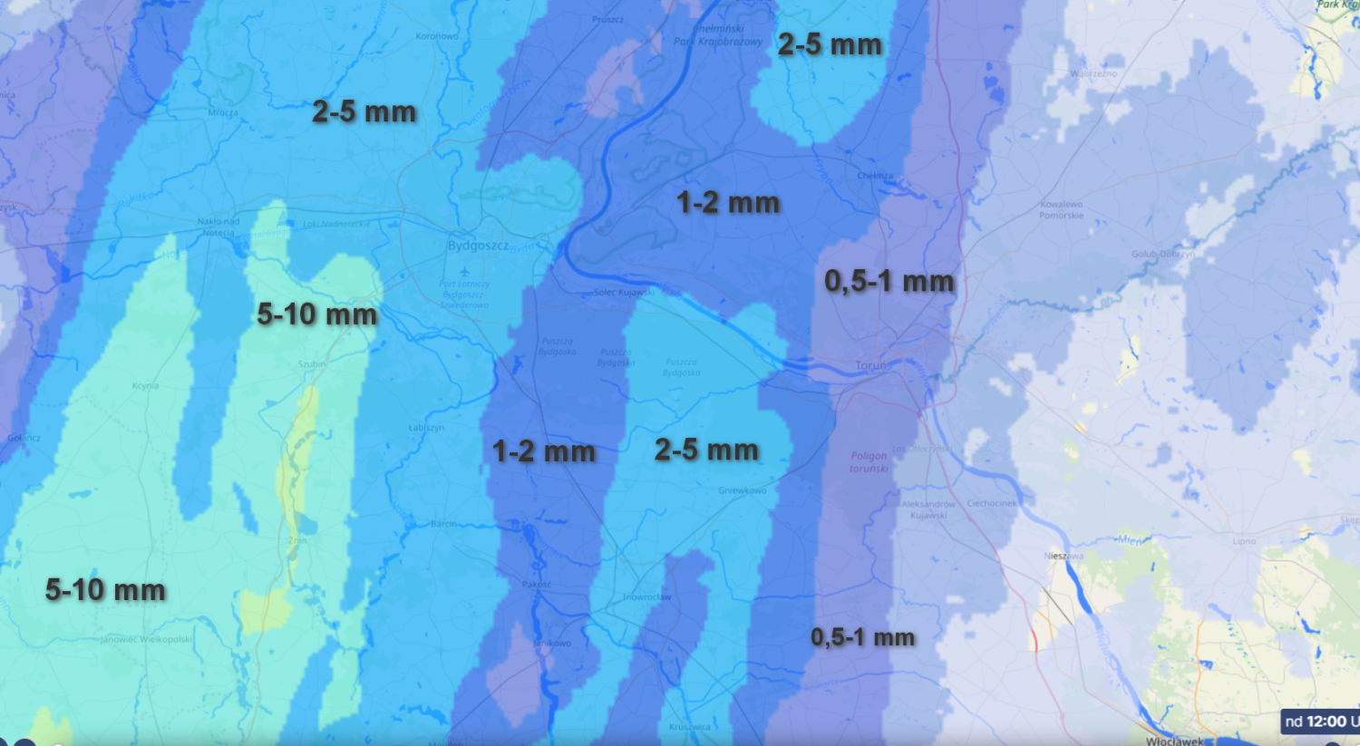 W Toruniu spadło około 1 mm wody, a nieco bardziej obfite opady pojawiły się w zachodniej połowie naszego województwa (4-8 mm, lokalnie powyżej 10 mm).