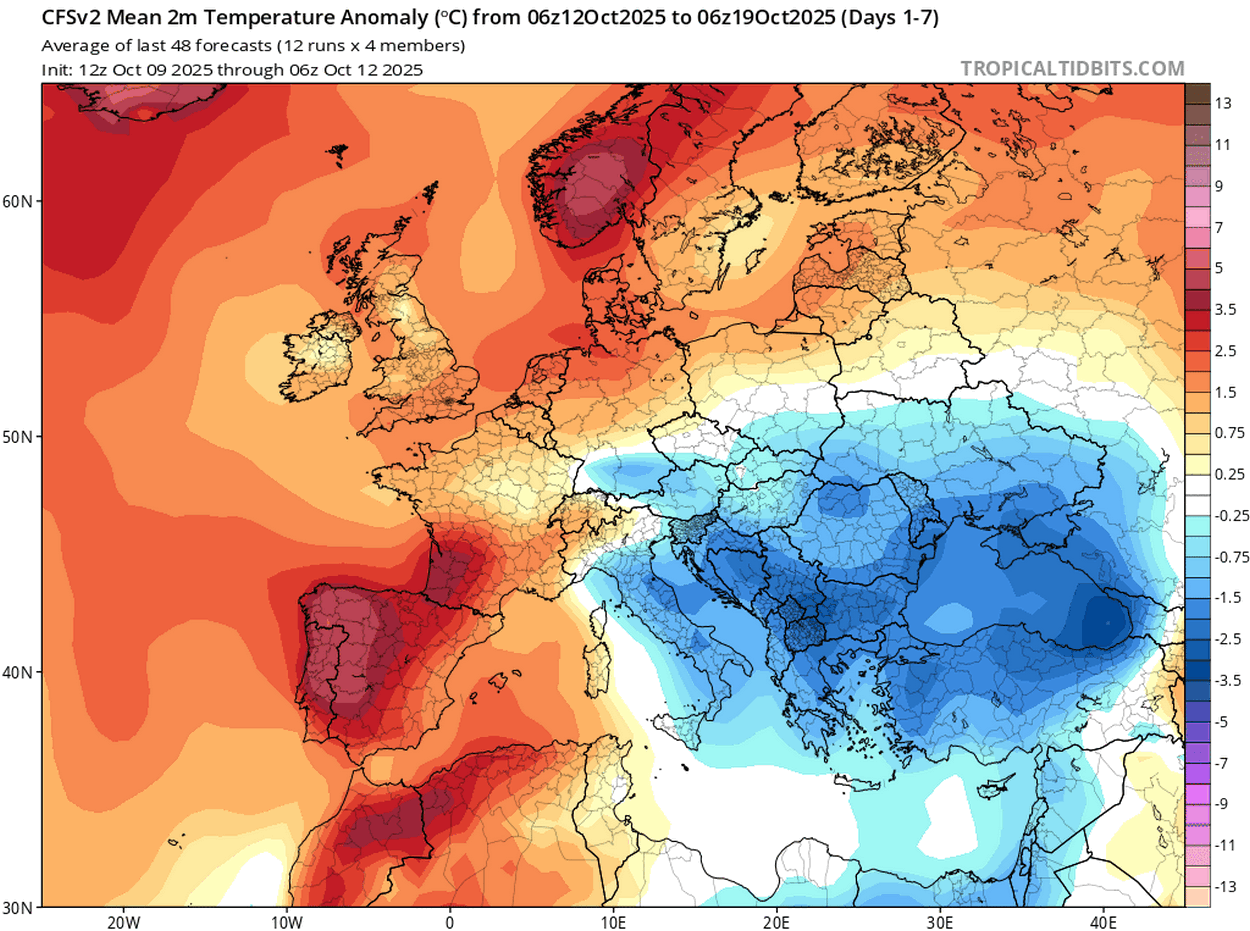 W Toruniu okres od 12 do 19 października zapisze się jako normalny pod względem termicznym dla połowy obecnego miesiąca. Patrząc szerzej, to nadal południowo wschodnia Europa będzie chłodniejsza od normy (odcienie niebieskiego na poniższej mapie), a pozostała część kontynentu będzie w normie lub powyżej normy (odcienie czerwieni). Na bieżące informacje o pogodzie zapraszam na Pogoda w Toruniu