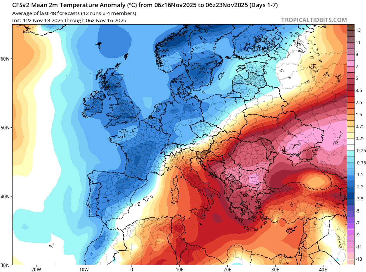Mapa anomalii temperatury powietrza w okresie od 16 do 23 listopada - https://www.tropicaltidbits.com