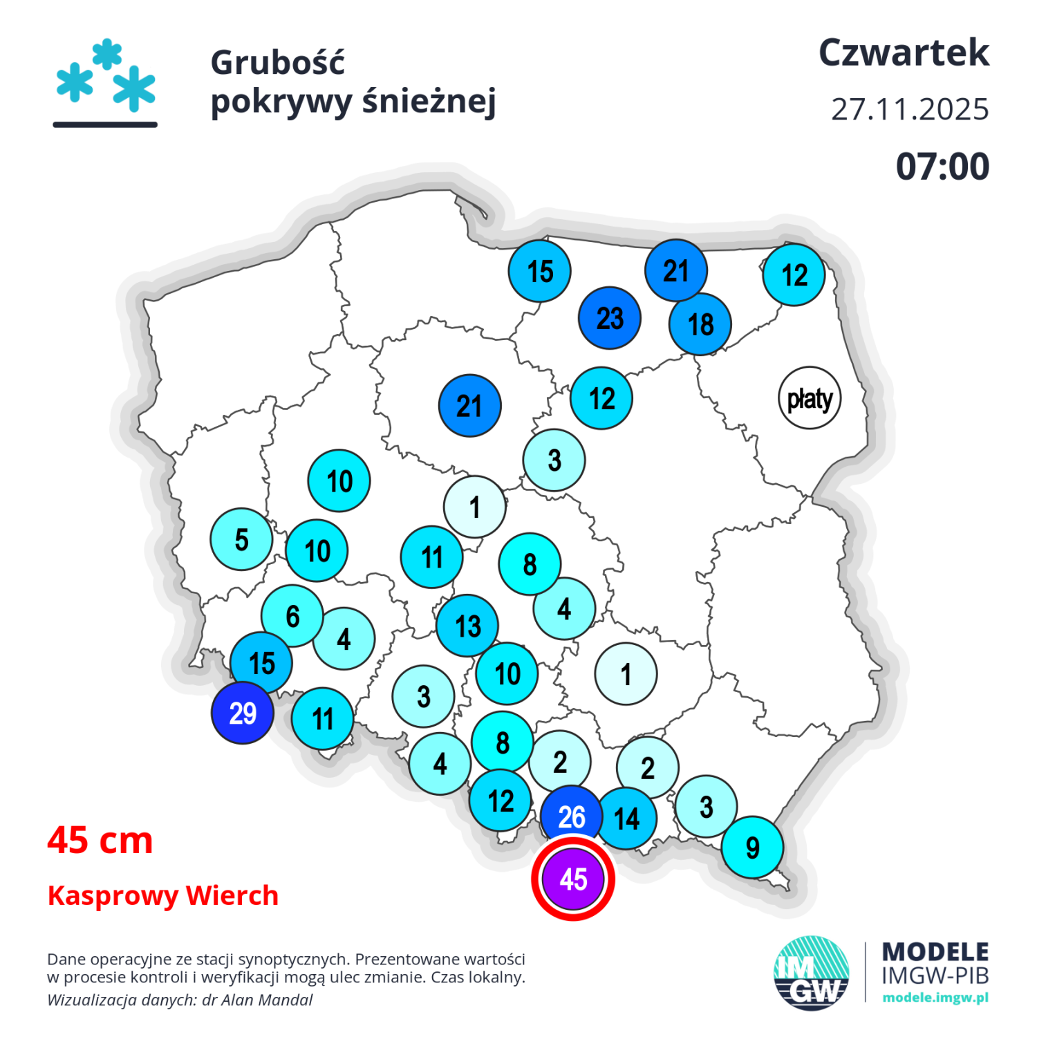 Za nami obfite opady śniegu. W Toruniu w czwartek rano pokrywa śnieżna miała 21 cm grubości. Jeszcze dzień wcześniej były to zaledwie 4 cm. Ekwiwalent wodny tego śniegu wyniósł około 20-21 mm wody. Najbardziej obfite opady śniegu objęły zwłaszcza województwo Warmińsko-Mazurskie i Kujawsko-Pomorskie. Ze stacji synoptycznych najwięcej śniegu leży na Kasprowym Wierchu (45 cm).