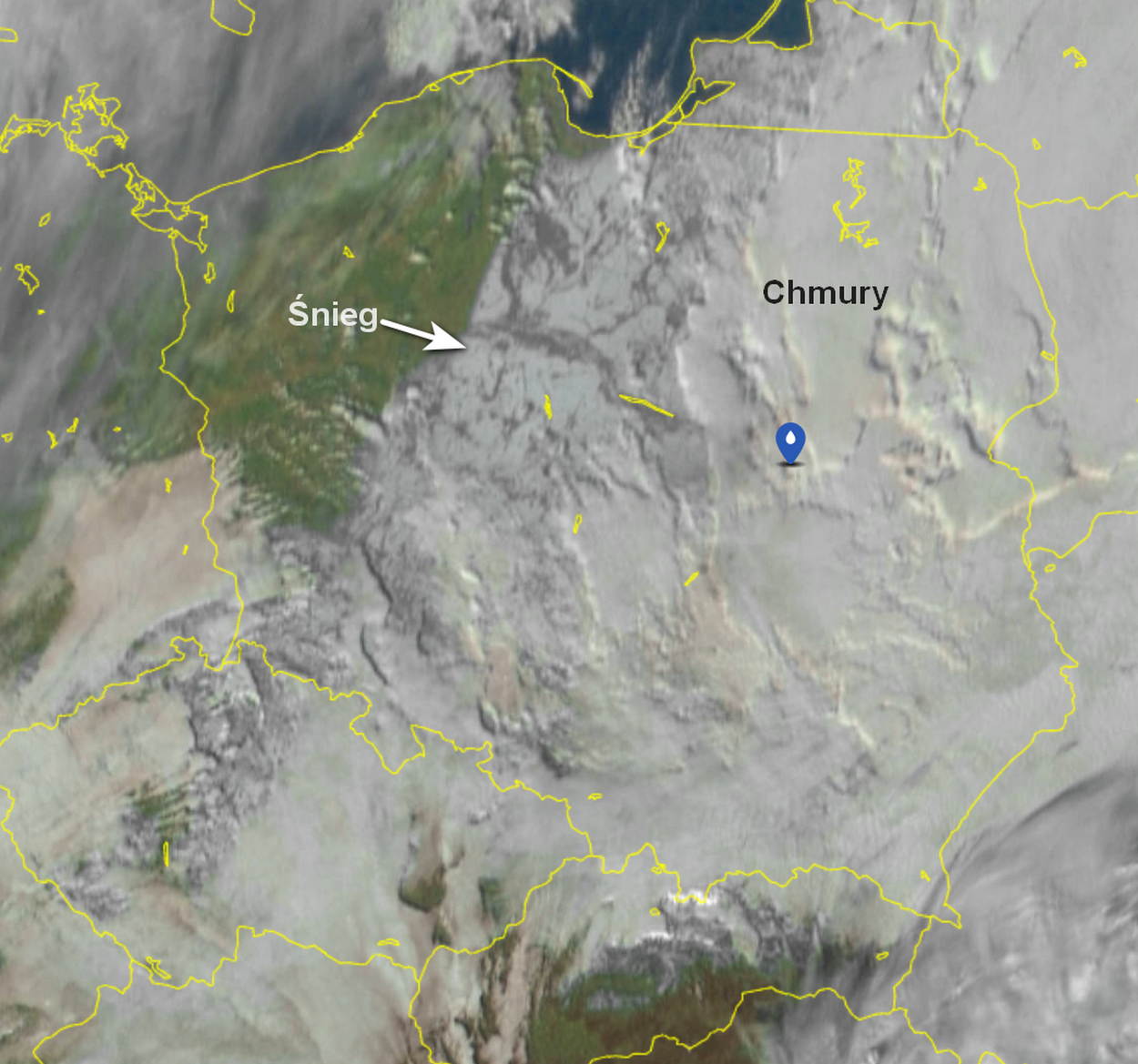 Na czwartkowym zdjęciu satelitarnym dzięki zanikowi chmur widoczna jest pokrywa śnieżna w naszym regionie. Nieco ciemniejsze są zarysy lasów iglastych. Na zachodzie naszego województwa widoczne jest wręcz odcięcie pokrywy śnieżnej. Pomorze, Wybrzeże i zachód kraju bez śniegu. Powtórki śnieżnego incydentu na razie w prognozach nie widać... Zdjęcie: www.sat24.com