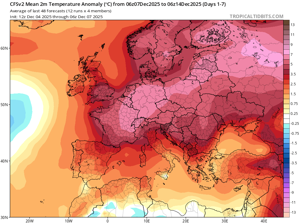 Średnia temperatura tygodnia będzie się kształtować znacznie powyżej normy wieloletniej (będzie znacznie cieplej niż normalnie o tej porze roku). Praktycznie cała Europa będzie objęta silną dodatnią anomalią temperatury powietrza – oznaczona odcieniami czerwieni na poniższej mapie.