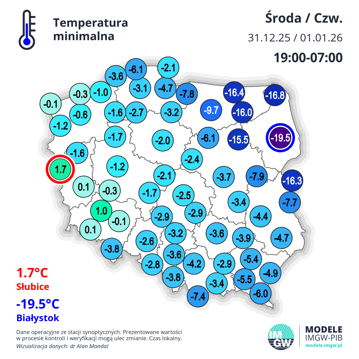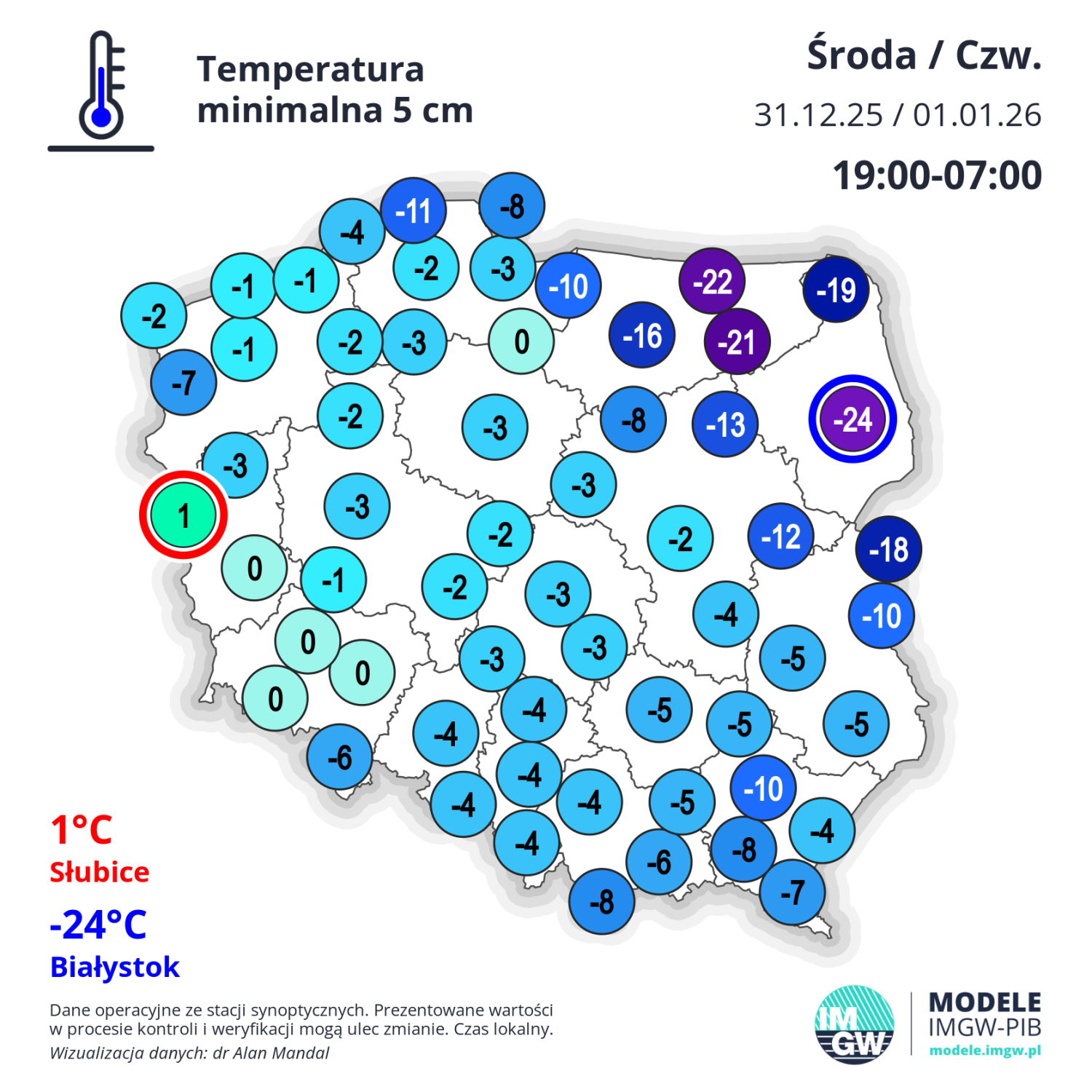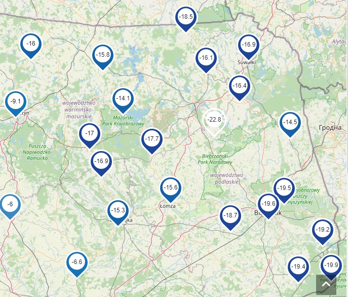 Sylwestrowa noc była bardzo mroźna we wschodniej części Mazur, na Podlasiu i Suwalszczyźnie - temperatura powietrza spadła poniżej -15 st. W Białymstoku temperatura powietrza na wysokości 2 metrów nad ziemią obniżyła się do -19,5 st., a przy gruncie do -24 st.! Źródło map: https://rafalraczynski.com.pl; IMGW-PIB