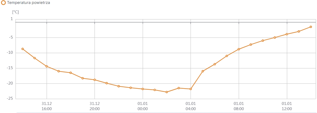 Jeszcze zimniej było na stacji pomiarowej w Biebrzy, gdzie na wysokości 2 metrów temperatura spadła do -22,8 st.! (wykres poniżej). Przy gruncie zdecydowanie poniżej -26 st. Tak znaczny spadek temperatury był spowodowany zalegającą kilku / kilkunastocentymetrową pokrywą śnieżną, adwekcją (napływem) zimnej masy powietrza, słabym wiatrem i głównie zanikiem chmur (nastąpiło silne wypromieniowanie "ciepła" w górę atmosfery, które nie zatrzymała kołderka z chmur).