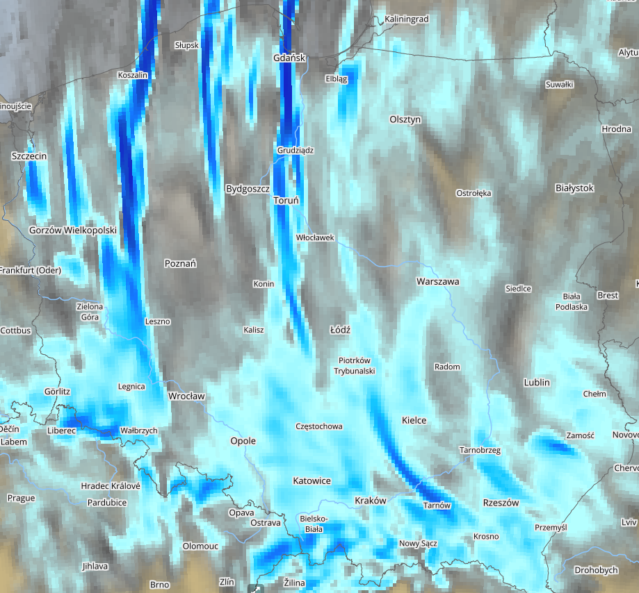 W sobotę po bardzo mroźnym poranku, po południu mróz zelżeje do około -4/-3 st. i czasami może popadać śnieg, nasilający się w drugiej połowie dnia. Słońce czasami zaświeci zza chmur. W nocy z soboty na niedzielę mróz zaledwie 4 stopniowy, ale często może popadać śnieg, okresami i lokalnie intensywny (biało i ślisko) - nad ranem możliwe są zawieje i zamiecie śnieżne. Miejscami może spaść 10-15 cm śniegu. Na poniższej mapie kolorem niebieskim zaznaczono orientacyjne strefy opadów śniegu podczas nocy z soboty na niedzielę (https://www.meteo.pl/mapy).