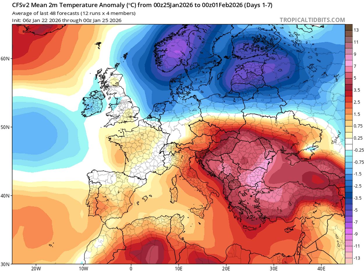 W okresie do 1 lutego Polska będzie pomiędzy silną anomalią ujemną temperatury obejmującą północną Europę (będzie tam znacznie zimniej niż normalnie - odcienie niebieskiego na poniższej mapie), a znaczną anomalią dodatnią temperatury (zdecydowanie cieplej od normy - odcienie czerwieni na poniższej mapie) obejmującą głównie południowo wschodnią Europę. Źródło mapy anomalii temperatury powietrza TROPICALTIDBITS.COM