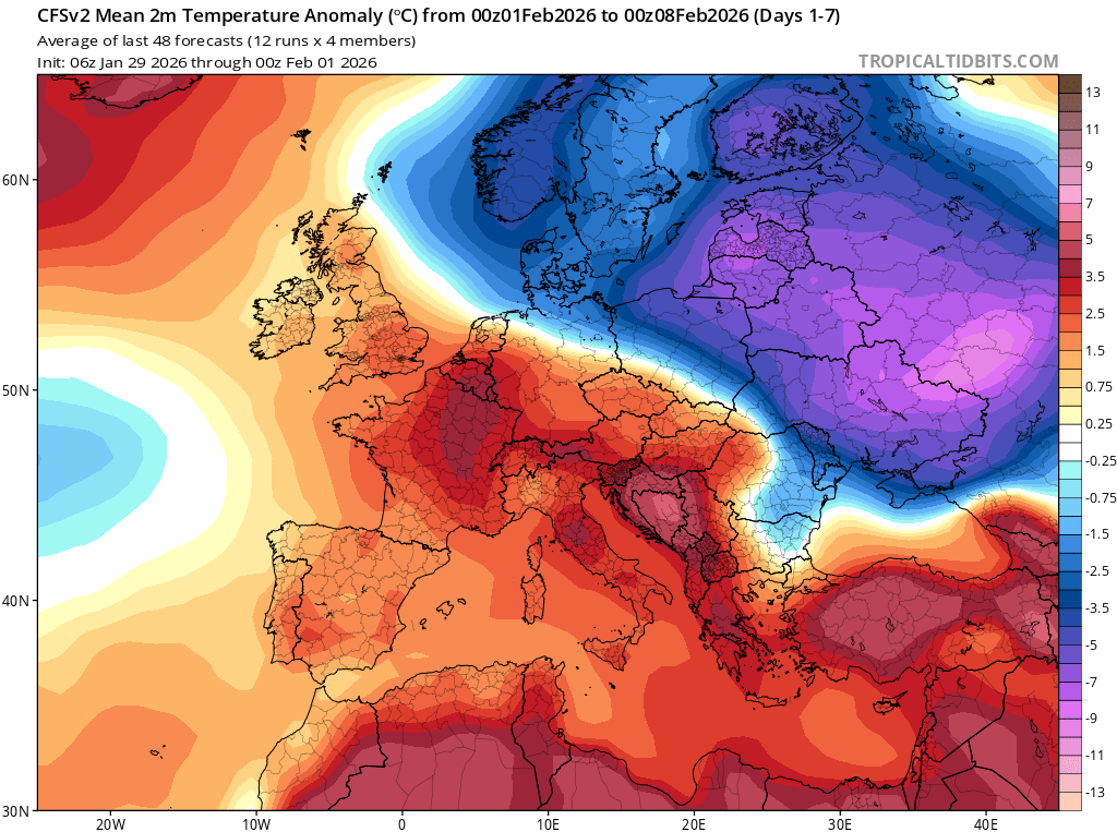 Na poniżej mapie mamy prognozowaną anomalię temperatury powietrza do 8 lutego w Europie - TROPICALTIDBITS.COM. Utrzyma się podział na zdecydowanie cieplejsze południe i częściowo zachód Europy (temperatura powyżej normy – odcienie czerwieni na mapie) i zdecydowanie zimniejszą północ oraz wschód kontynentu (będzie zimniej niż normalnie – odcienie niebieskiego na mapie).