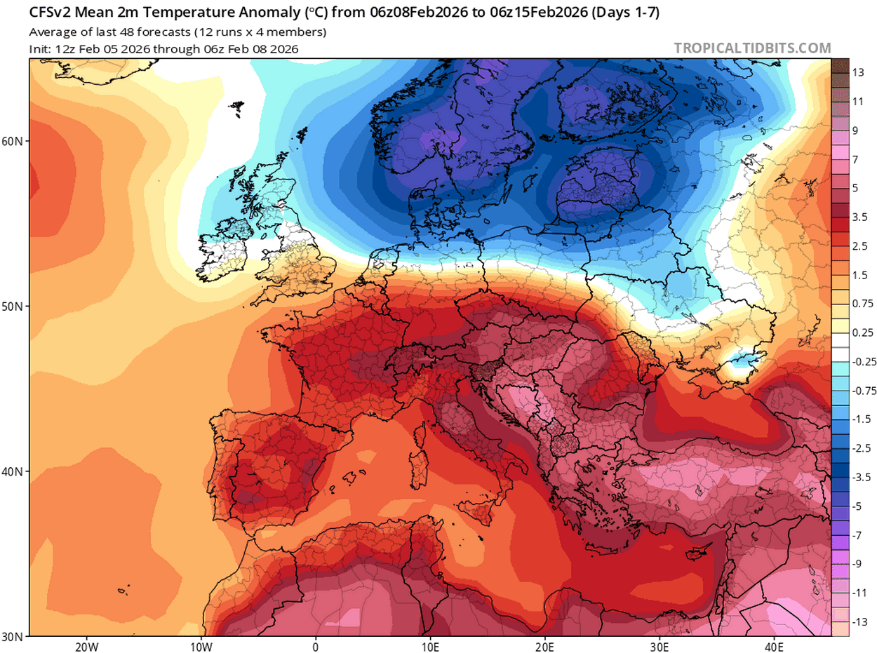 Do 15 lutego Europa nadal będzie podzielona na zdecydowanie zimniejszą niż normalnie północ (odcienie niebieskiego na mapie) i wyraźnie cieplejsze od normy południe Europy (odcienie czerwieni na mapie).