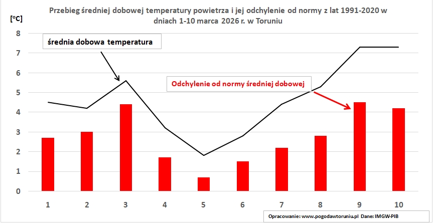 W pierwszej dekadzie średnia temperatura dobowa każdego dnia marca w Toruniu była wyższa od normy (czerwone słupki na wykresie). Średnia dobowa temperatura była wyraźnie dodatnia (czarna linia na wykresie) charakterystyczna dla przedwiośnia i częściowo wiosny termicznej.