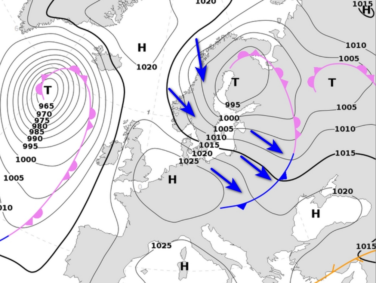 W tzw. lany poniedziałek, co prawda lać się z nieba nie powinno, ale sporadycznie nie można wykluczyć przelotnego deszczu. Do tego dominować będą chmury, z nielicznymi przebłyskami Słońca. Odczujemy również znacznie chłodniejsze powietrze i temperatura wzrośnie maksymalnie do 9 / 10 st. - docierać ono będzie z północnego zachodu za sprawą niżu znad Finlandii (mapa synoptyczna poniżej - https://www.wetterzentrale.de/). Należy jednak zaznaczyć, że temperatura odczuwalna będzie niższa, z powodu dość silnego i porywistego zachodniego wiatru o prędkości do około 60 km/h.