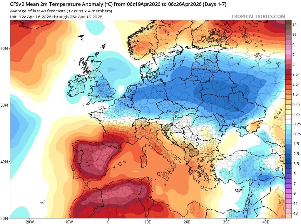 Prognozowana anomalia temperatury do 26 kwietnia 2026 r.b (TROPICALTIIDBITS.COM)